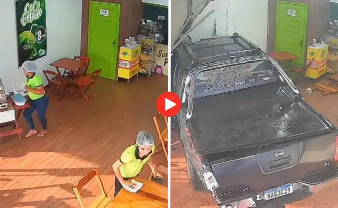 O vídeo, gravado por volta das 17h36, mostra as colaboradoras circulando na área da lanchonete, organizando o espaço que seria atingido pelo veículo minutos depois. Pouco após elas se afastarem e entrarem na parte interna do estabelecimento, a caminhonete aparece desgovernada e atravessa a estrutura, atingindo ainda o estabelecimento vizinho, causando grandes prejuízos materiais.