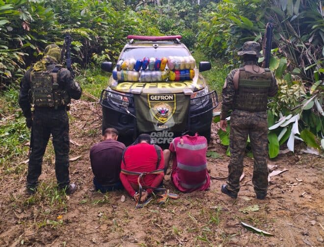 O Grupo Especial de Fronteira (GEFRON) prendeu três homens e apreendeu quase 30 quilos de drogas durante a Operação Protetor das Divisas e Fronteiras, realizada na zona rural de Rodrigues Alves, no Ramal do Bom Vento, região do Juruá. A ação é coordenada pelo Ministério da Justiça e Segurança Pública.