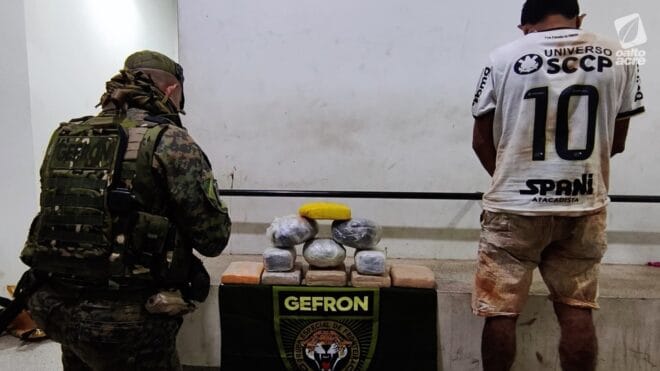 Durante patrulhamento na zona rural do município de Mâncio Lima, a Secretaria de Estado de Justiça e Segurança Pública (Sejusp), por meio do Grupo Especial de Fronteira (Gefron), prendeu um homem por tráfico de drogas. A ação faz parte da Operação Protetor das Divisas e Fronteiras, que visa combater crimes transfronteiriços.