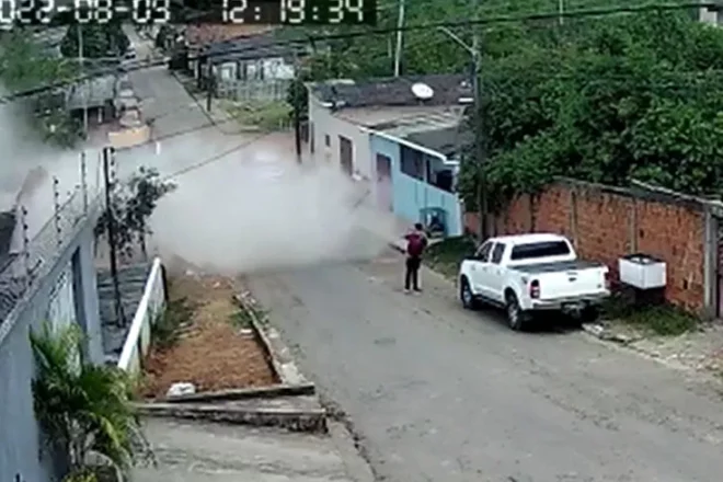 Um vídeo divulgado nas redes sociais mostra o momento exato do desabamento, que durou poucos segundos, mas pegou os vizinho de surpresa.