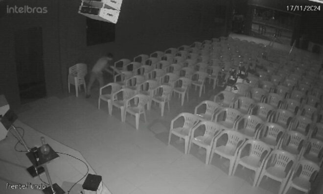 Uma igreja evangélica localizada no centro de Brasileia, foi arrombada na madrugada deste domingo, 17. Câmeras de segurança registraram o momento em que o suspeito invadiu o templo e cometeu o crime.