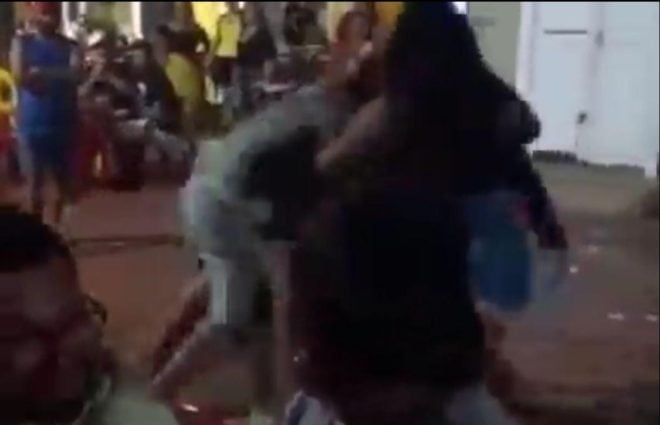 Na legenda, o internauta que compartilhou o vídeo não deu os detalhes do motivo da briga, mas indicou que seria pelo ‘presente de Deus’, ou seja, um dos homens que estava acompanhando a mulher.