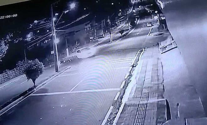 Imagens de uma câmera de segurança mostram o momento exato do acidente e o impacto da batida. A moto seguia em alta velocidade pela rua do Muru quando bateu no carro que estava na avenida Lauro Muller.