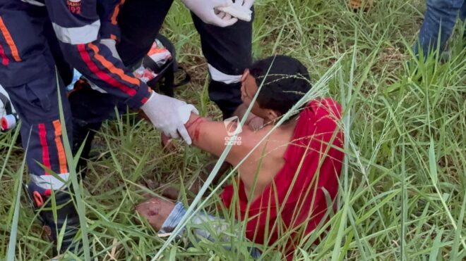 O motociclista Leandro Nascimento Conceição, de 27 anos, ficou gravemente ferido após cair em um barranco ao tentar desviar de outra moto, no final da tarde desta quarta-feira (20), no cruzamento da Rua Flamengo com a Rua Mário Maia, no bairro Defesa Civil, região do Tancredo Neves, em Rio Branco.