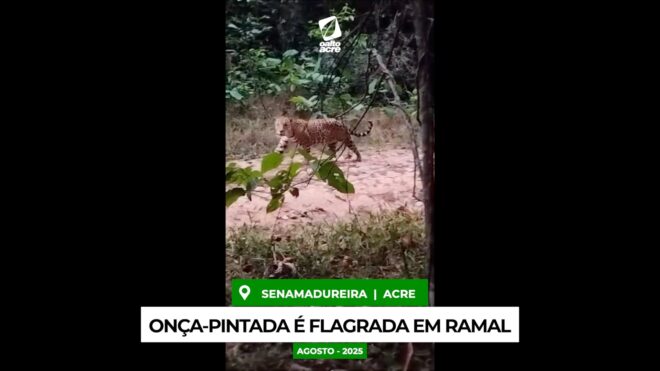 Um vídeo que circula nas redes sociais mostra uma onça-pintada caminhando pelo ramal Toco Preto, na zona rural de Sena Madureira. O registro foi feito por um morador, que ao avistar o animal, se escondeu e conseguiu filmar a cena.