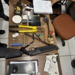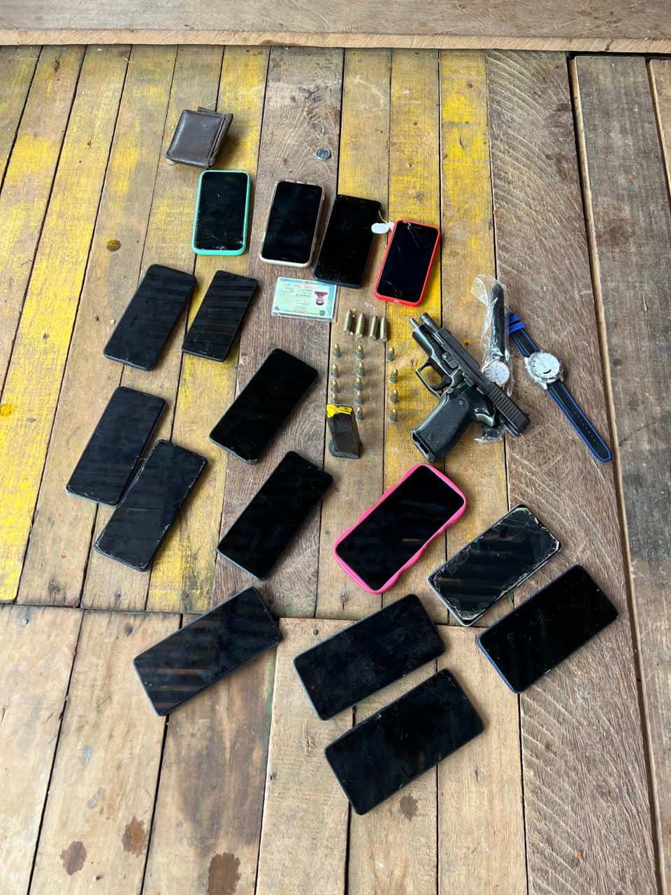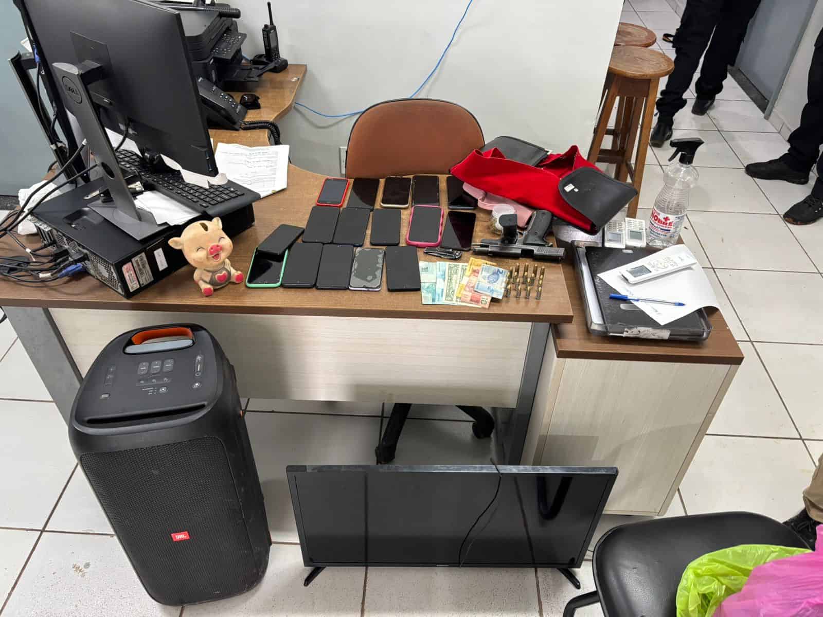 Entre os materiais apreendidos, estão uma pistola 9mm, um rifle, munições de calibre .38, celulares, entorpecentes(incluindo porções suspeitas de ecstasy), balanças de precisão e materiais para embalar drogas.