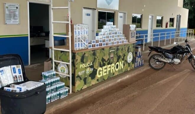 Na manhã da última quarta-feira, 23 , a Secretaria de Justiça e Segurança Pública (SEJUSP), por meio do Grupo Especial de Fronteira (GEFRON), realizou duas importantes apreensões em operações na região de fronteira com a Bolívia. As ações resultaram na interceptação de uma motocicleta, na apreensão de 2.500 maços de cigarros contrabandeados e de diversos produtos oriundos de descaminho.