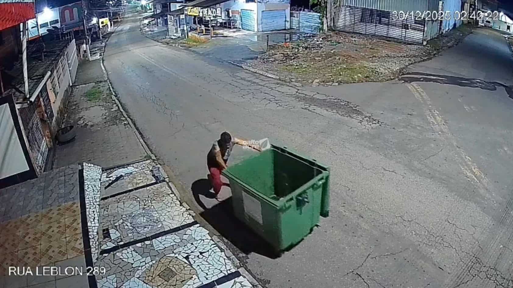 Um homem em situação de rua foi flagrado por câmeras de segurança furtando uma lixeira durante a madrugada desta terça-feira (30), no conjunto Castelo Branco, em Rio Branco. A ação ocorreu na Rua Afrânio Peixoto e foi registrada por equipamentos de monitoramento instalados em uma residência da via.