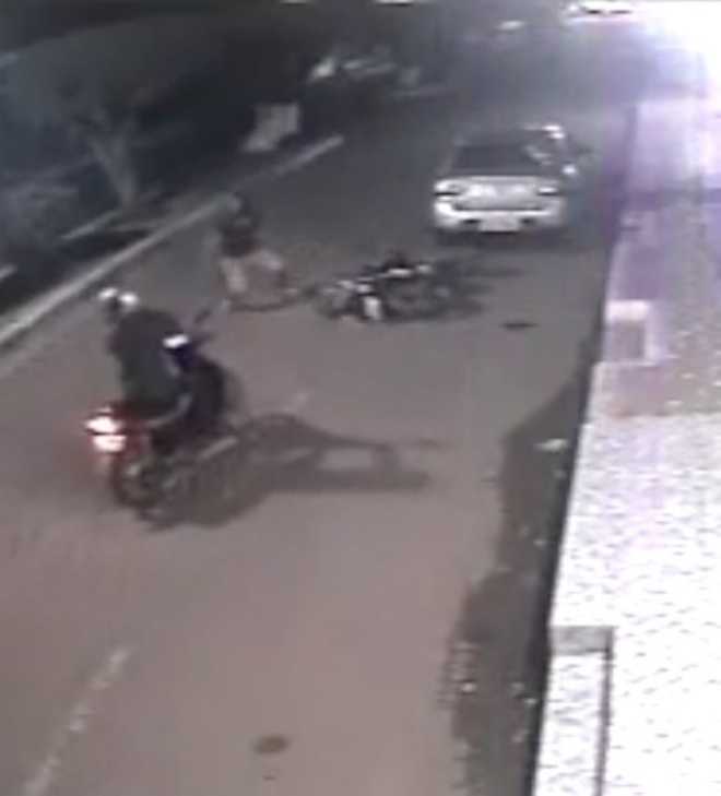 Após ser alvejado, os bandidos caíram com a moto e foram cercados pelo GIRO. Um morreu – Foto/Captura