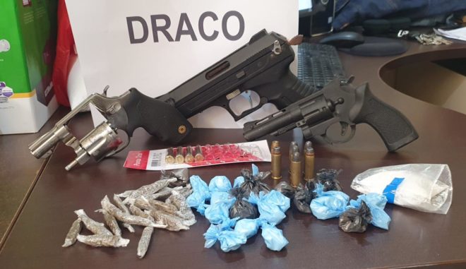 A ação, coordenada pelo delegado Pedro Paulo Buzolin, resultou na apreensão de duas armas de fogo, um simulacro, droga e na prisão de dois indivíduos, um deles com 3 mandados de prisao em aberto pelos Estados de Mato Grosso e Rio de Janeiro.