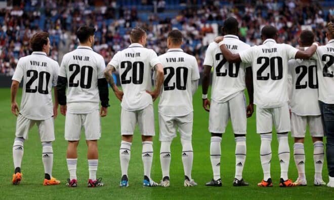 Uma das demonstrações de apoio veio do elenco do Real Madrid. Os jogadores da equipe Merengue, titulares e reservas, entraram em campo com a camisa de número 20 de Vinicius Júnior.