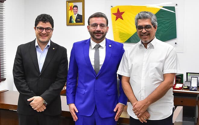 Na manhã desta quinta-feira, a Assembleia Legislativa do Acre (Aleac) recebeu a visita do vice-presidente da Assembleia Legislativa de Rondônia (ALE/RO), deputado Ribeiro do Sinpol (PRD). O parlamentar foi recebido pelo vice-presidente da Aleac, deputado Eduardo Ribeiro (PSD) e Edvaldo Magalhães (PCdoB) em um encontro que teve como foco o fortalecimento das relações institucionais e o desenvolvimento econômico dos dois estados.