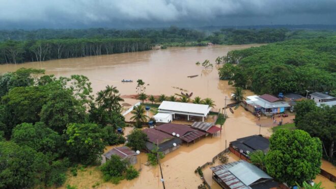 Vista aérea de Assis Brasil, acima da Colônia dos Pescadores, foi alcançada pelo rio nesta semana.
