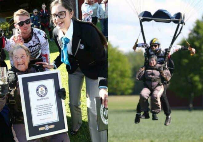Em 2019, ela fez seu primeiro salto de paraquedas aos 101 anos. Mas não foi um recorde mundial.