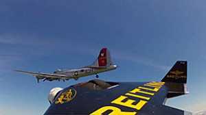 Yves Rossy voou junto com o B-17 usando um traje feito de carbono e uma blindagem do tipo kevlar. O equipamento do suíço também inclui quatro motores.